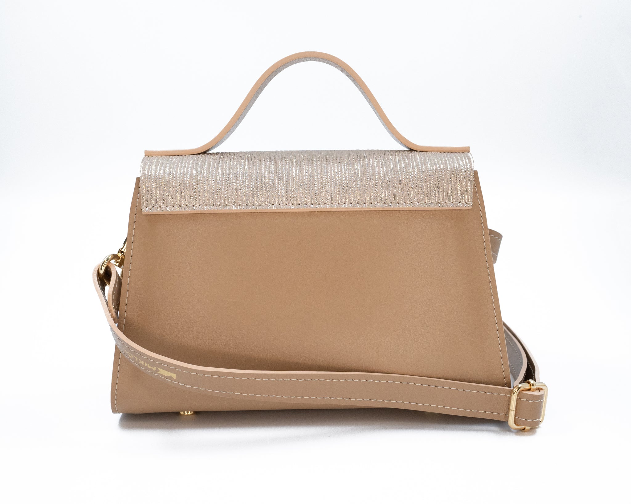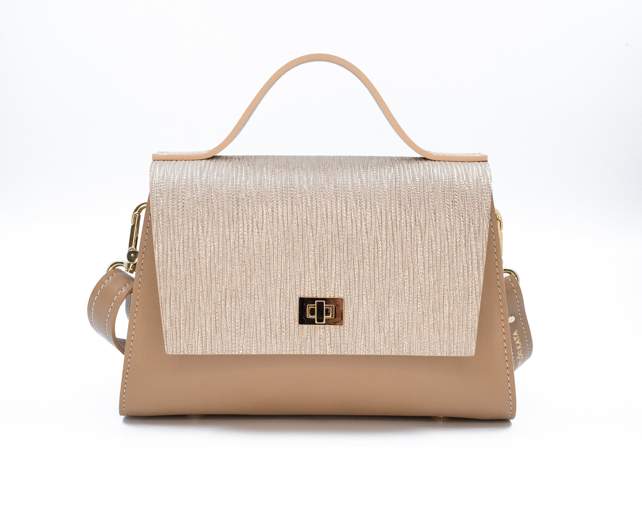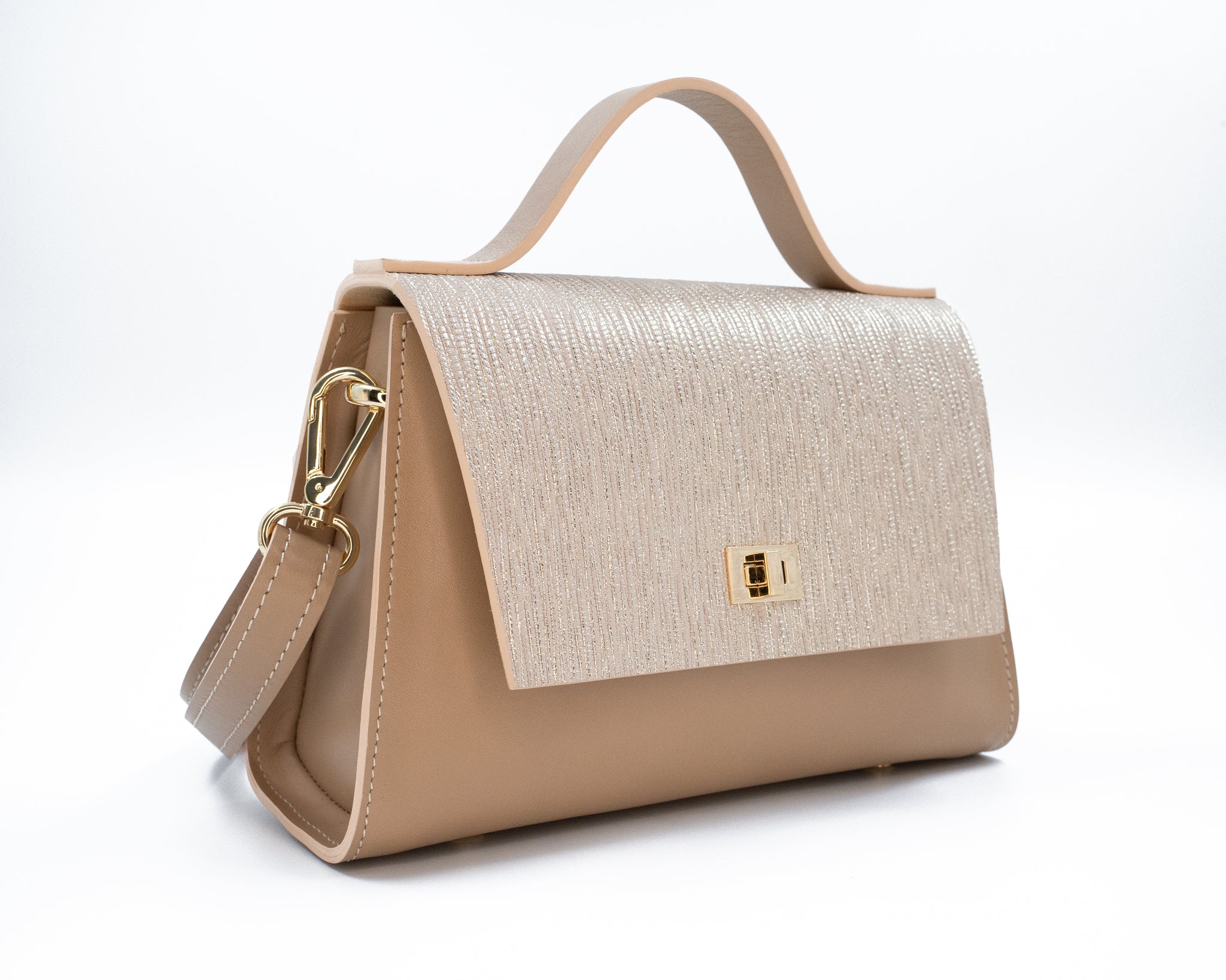 Geantă bej din piele naturală cu închizătoare aurie, elegantă și rafinată, accesoriu de damă pe fundal alb.