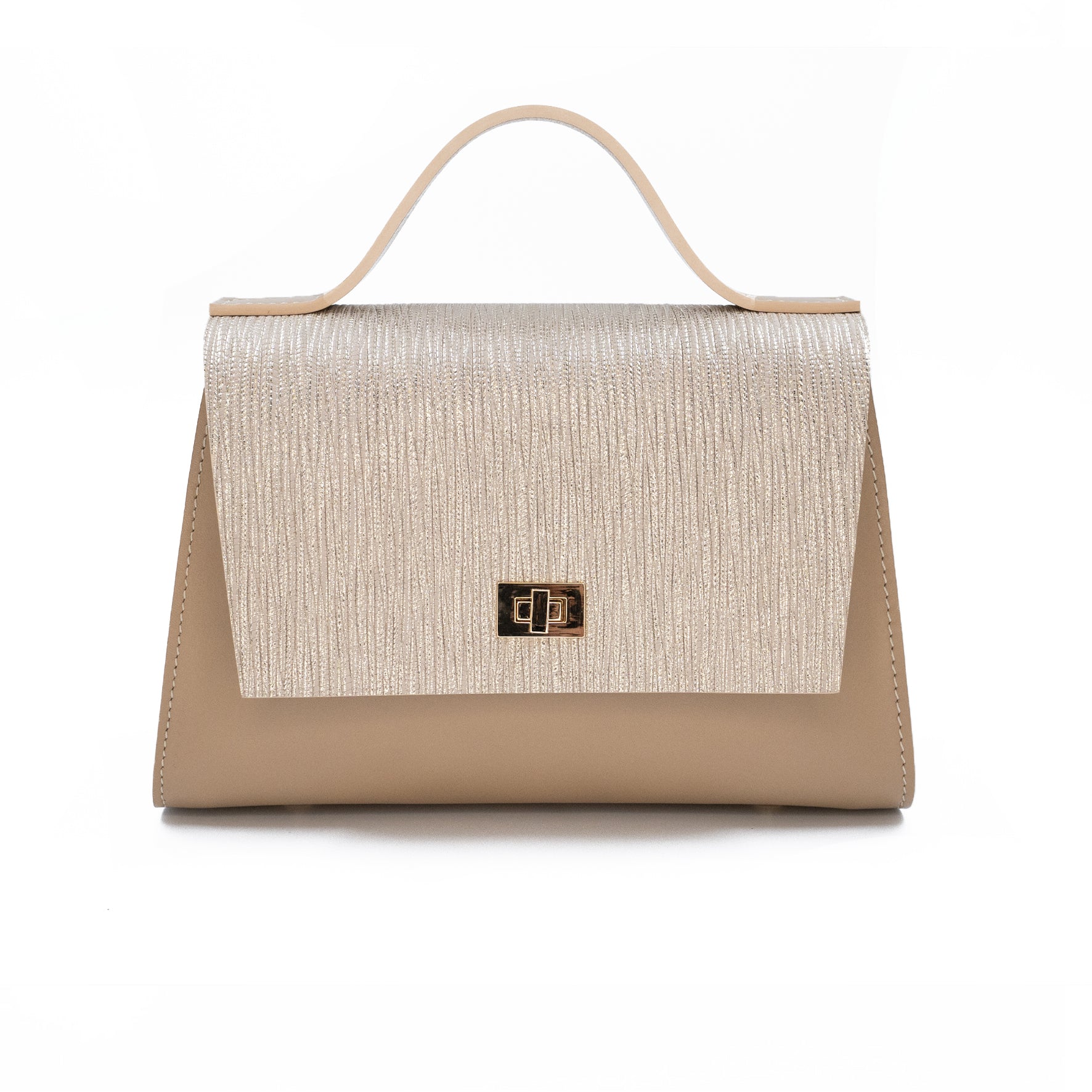 Geantă de damă bej din piele naturală, cu închidere aurie, stil lux și design elegant, ideală pentru ocazii speciale, pe fundal alb.