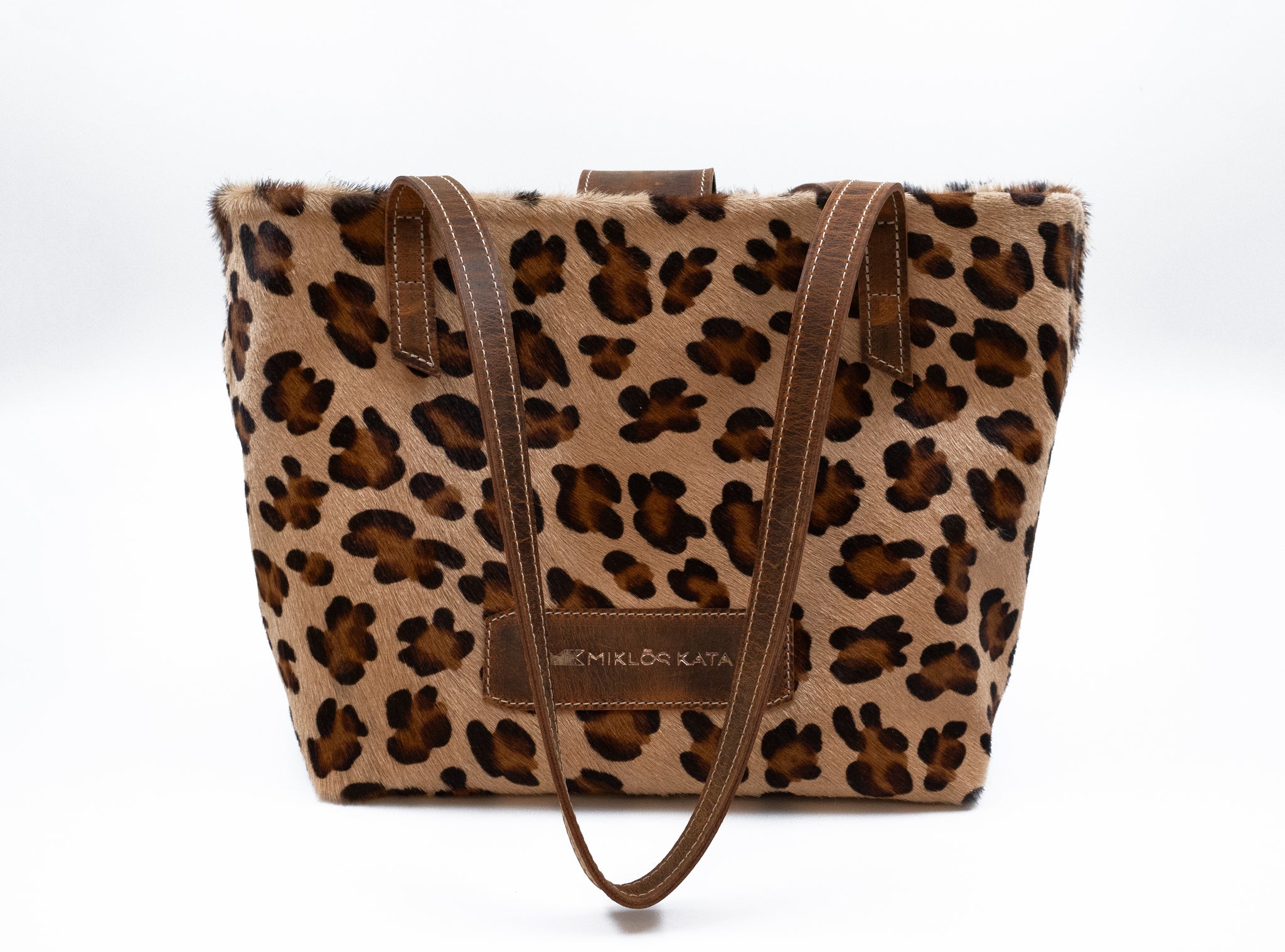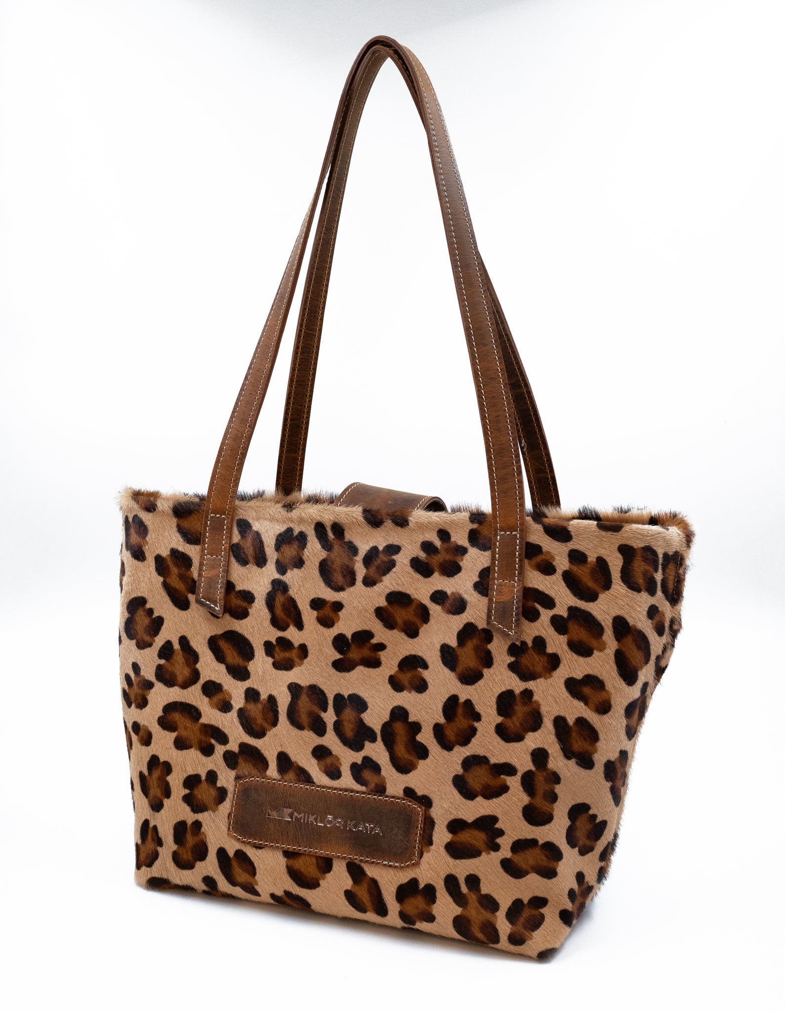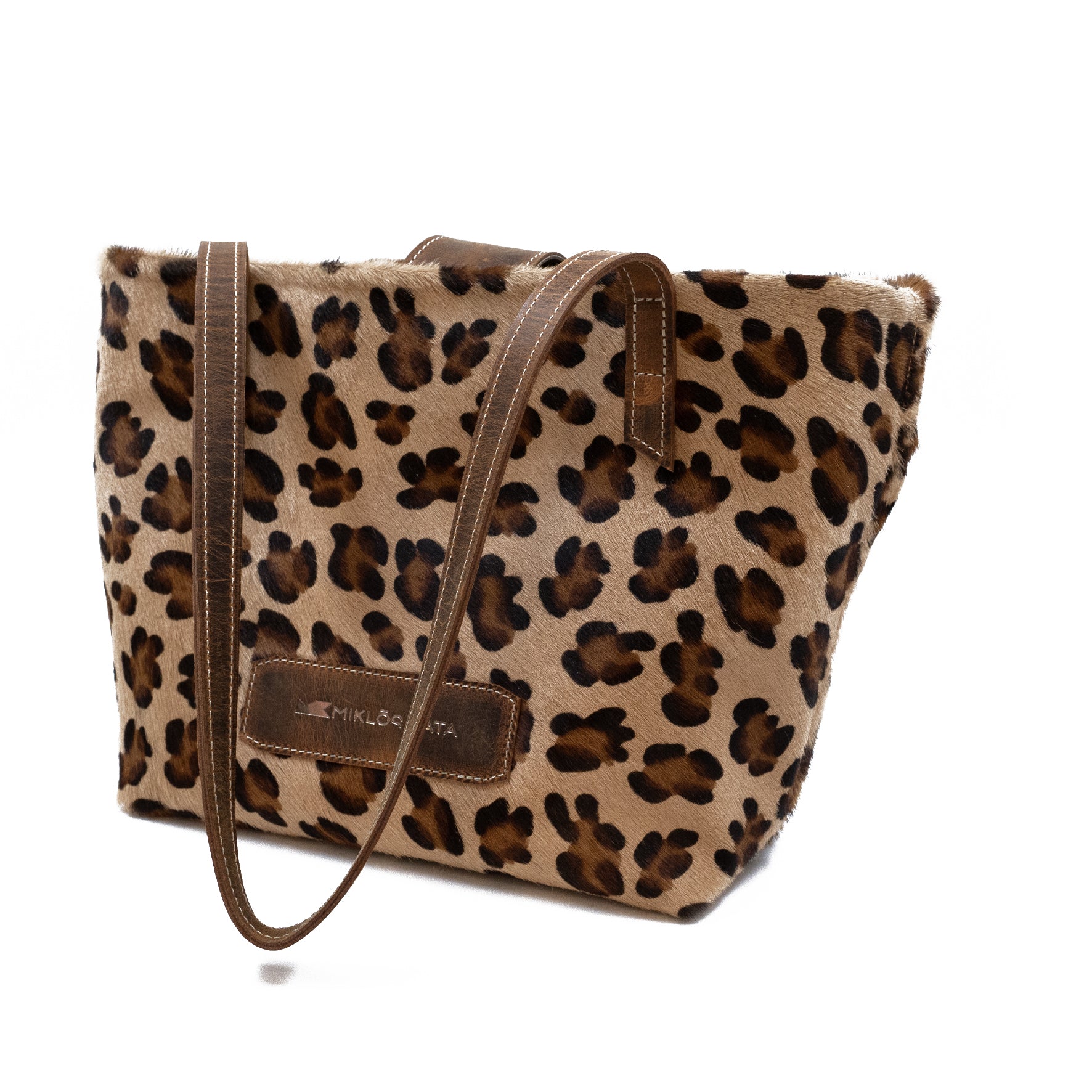 Geantă shopper cu imprimeu leopard și mânere maro, pe fundal alb.
