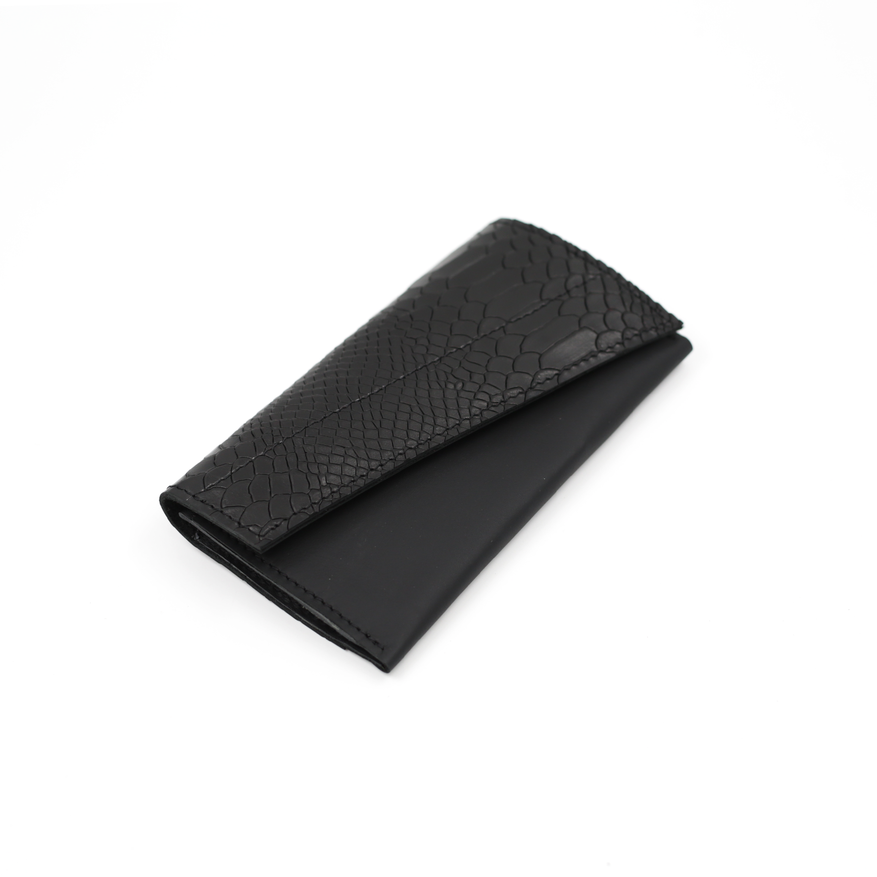 A black leather wallet with a textured pattern, closed with a magnetic snap.