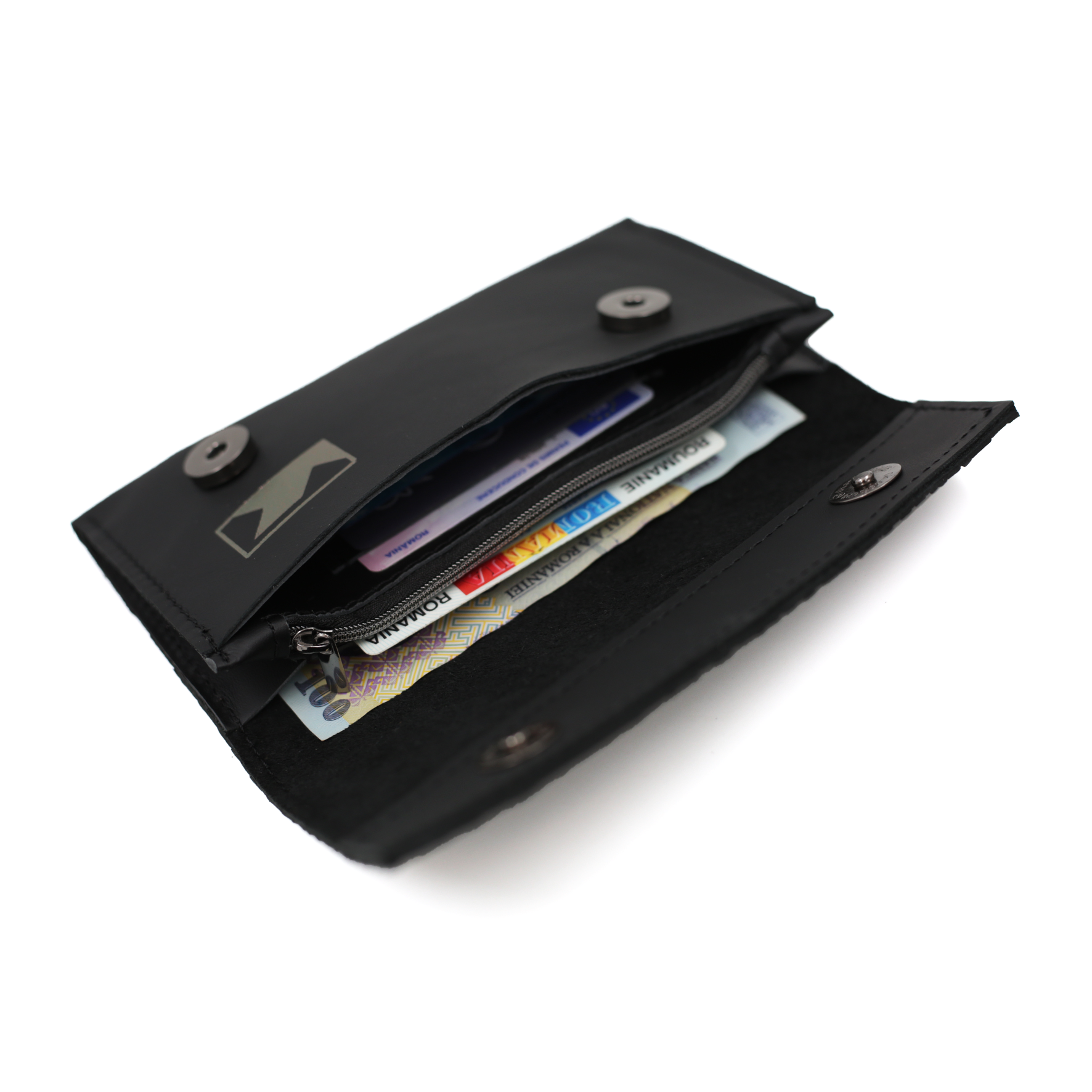 Portofelul se poate închide cu o capsă magnetică, o soluție sigură și ușoară. Designul interior oferă o capacitate maximă de stocare, cu compartimente separate pentru carduri, legitimație sau alte documente și, bineînțeles, o secțiune mai mare pentru bancnote. Există, de asemenea, un buzunar mic cu fermoar pentru monede.